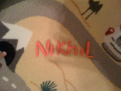 Dec 4th,  2008 - One of the things that I love to do at school is play with Play-Doh. For those who do not know what Play-Doh is, its like clay that kids can play with to make whatever our minds imagine. Right now all I care about it to putting it in my hands and have fun. My mother taught me how to make a sphere and then we used some bits of the play-doh to spell my name ...N I K H I L. |