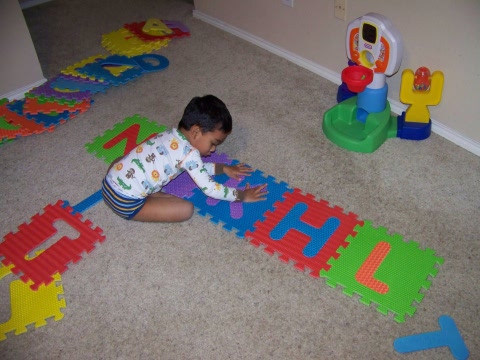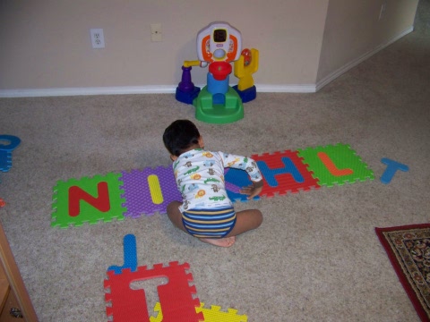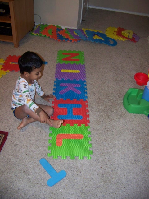 Dec 7th,  2008 - As Barney says,         "I am ready to spell my name, each and every letter My mother has taught me how to spell my name and today I decided to take my large alphabet puzzle pieces. Unfortunately, my name has two Is so while my real name is N I K H I L, I was only able to spell it as NIKHL which still says NIKHIL. I really enjoy spelling my name. |