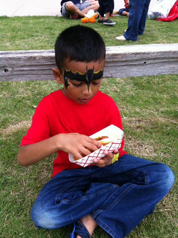 | May 12th, 2012 - Every year the city of Coppell has an outdoor event called "Bounce". Well, you if guessed inflatable rides and bounce houses, you guessed right! The event was held at the Wagon Wheel park where I used to go for my soccer games. They have around 10-12 bounce houses setup in the park. Some of for kids 5 and under and the rest are for the grown up kids. We got there around 11 in the morning and it was not very crowded. The lines were quite small and I got to go on all the rides. There was an Army Boot Camp bounce house, a fire station, a Hawaiin bounce house and many more. After some fun on the bounce houses, I decided to get my face painted. There was a long line but we waited patiently for our turn. The lady was nice and asked me what I would like to be and I said "Batman". She painted a really cool batman. After some face painting, it was back to the bounce houses. By lunch time, I was tired and hungry and the Coppell Police department had some free hot dogs, chips and drinks for us which was really nice. After lunch, I got to go inside the Coppell Fire Department's fire engines and take a look. They were really cool. I also got to mean the Chick Fil-A Eat More Chickin Cow!! Thank you Coppell for organizing this and I am looking forward to the Coppell Bounce Event of 2013. |