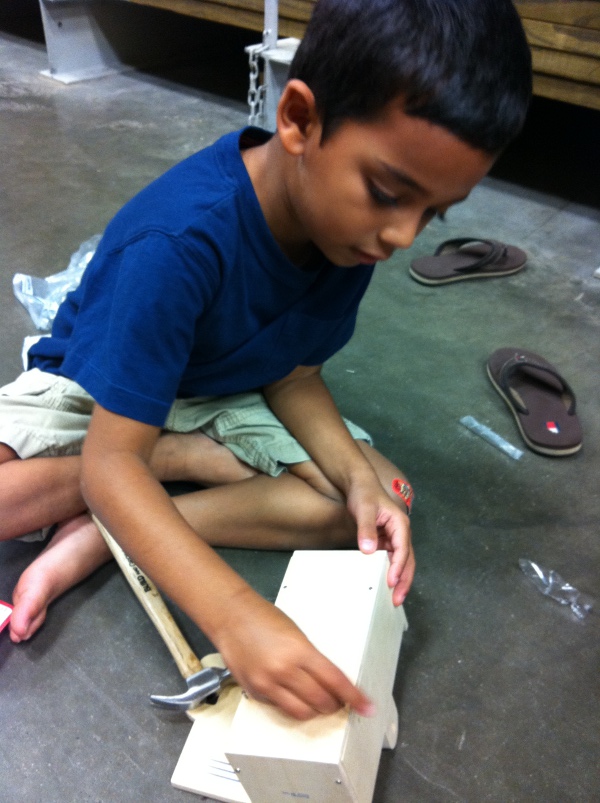 Aug 13th, 2011 - The Back-to-School spirit still lives on. I just completed my first week at school and this weekend Lowes had the 2nd project on the Back-to-School theme. We had to build a school locker. My mom had registered me so it was easy to get the kit. This project was quite simple compared to some of the ones I had done before especially the one from last week. We had to nail in 5 sides of the locker and finally nail in the front door. The locker also had a little shelf. Then came the fun part of putting in all the stickers. I put in stickers all over the locker (lots of sports stickers) on the sides. I was also able put my name on the locker too. It took us only 15 minutes today and once I was done, I took my certificate and my patch and we came home. I am looking forward to the next two Build and Grow sessions, we will be building a Police Car and a Fire Truck. |