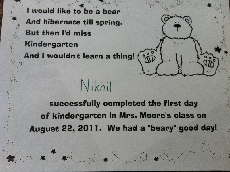Aug 26th, 2011 - A few days ago, I completed my first day at Kindergarten and now my first week is over, soon I will be graduating high school. Well, that day is far off, I have may years before I get that far. It was an exciting week so far. I have enjoyed going to school and doing all the activities like reading books, playing on the smart board, PE class, art class and everything else at school. I also made a lot of new friends this week, Amanda, Connor, Blake, Nico, Anu, Aromi, Madeline, Srikar, Vivek, Tanvi, Joshua and Radhika. At the end of each day, the teacher marks a sheet with how I did in school this week. If I did good, I get a sticker or a smiley. I got a smiley for every day this week. Also, if I reach school everyday before the bell, I get to attend a party of the end of the month. 3 more days to go and I will be able to attend the 1st party of the year. Next week, I have my assessment on Tuesday and in a couple of weeks, I will be having my first Bear parade. I am beary excited about that. An exciting 1st week at school. |