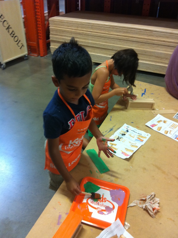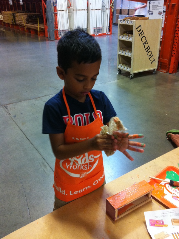 Aug 6th, 2011 - For the last year,my parents have been signing me up for the Build and Grow sessions at Lowes. Lowes has these session once every 2 or three weeks but Home Depot has them only on the 1st Saturday of every month. Today as the first time we were able to go. Unlike Lowes, you don't have to register with Home Depot. You just have to show up. The Home Depot sessions are from 9 AM - noon and we showed up at around 9:30. It was quite packed and very busy. We stood in line to register and get our kit which was a pencil box today (everyone is having a Back to School theme). The box could be built with only a couple of steps but it was rather difficult to push the nails in. I did need my dad's help on this. The Lowes kits are much easier for kids my age. After we built the box, came the fun part of coloring the box. We chose the Home Depot color, Orange for the main color and then used green for the lid. One of the nice Home Depot helpers gave me a plate with the colors and a nice brush. This was the first time I was able to paint something and it was a lot of fun. My hands and face were all messy but I guess thats the fun of it. After we completed the painting, I collected my certificate and my pin which I attached to my apron. The next one at Home Depot will be in September. |